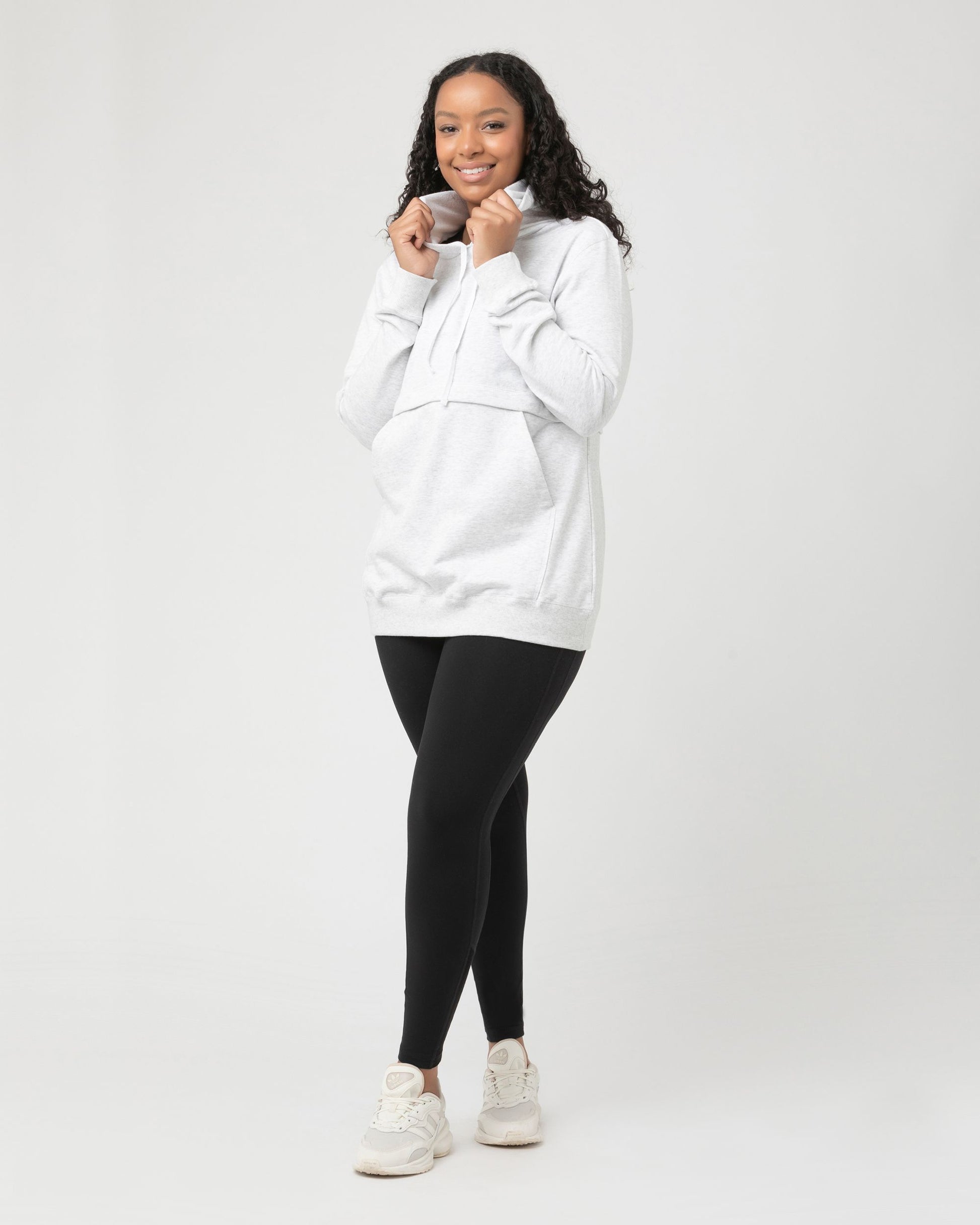 This cool-weather hoodie features a front pouch, hood, and zipper for easy-access nursing!