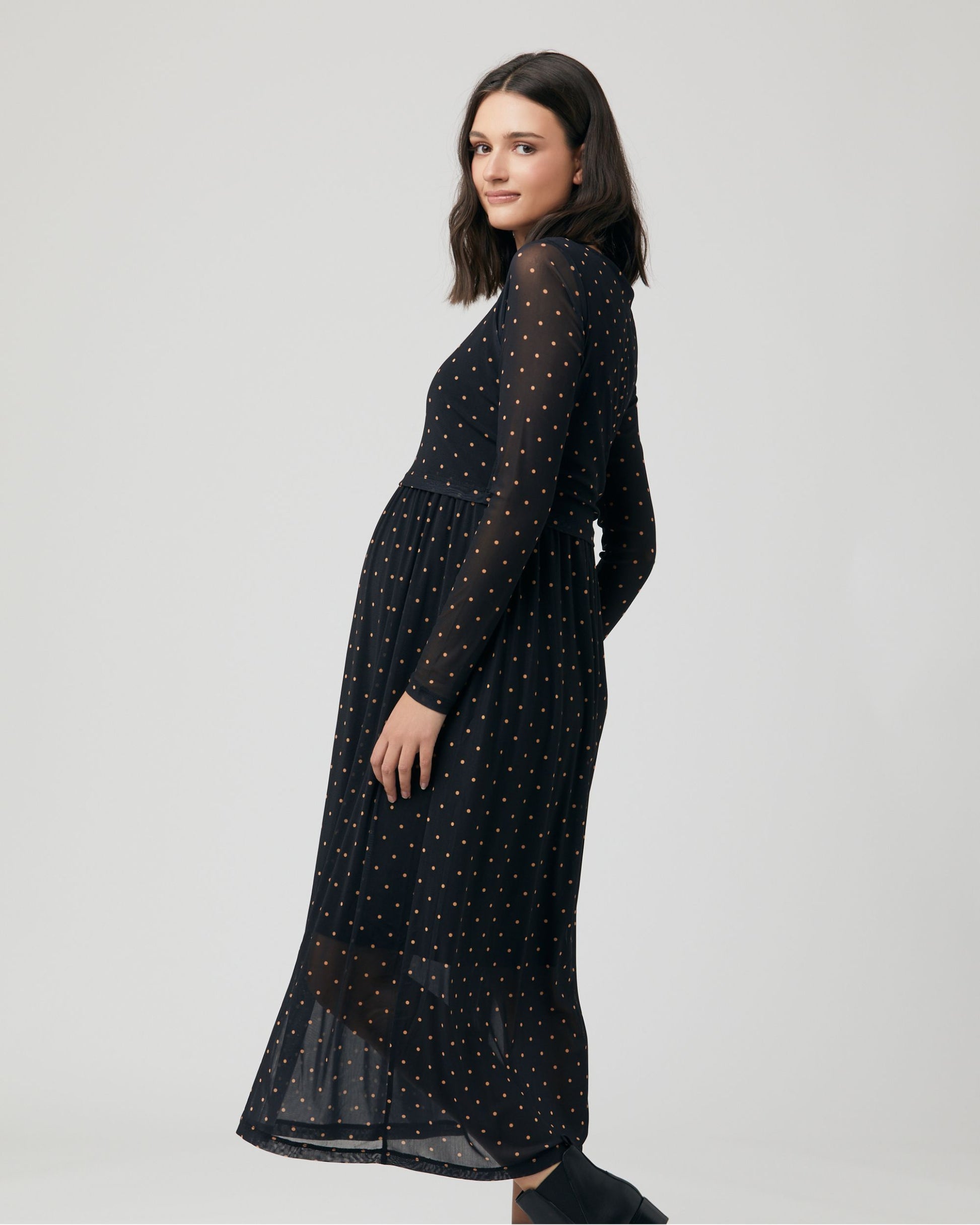 Cut from a printed mesh, the Dot Nursing Dress features full length sleeves, round neckline and hidden nursing access.