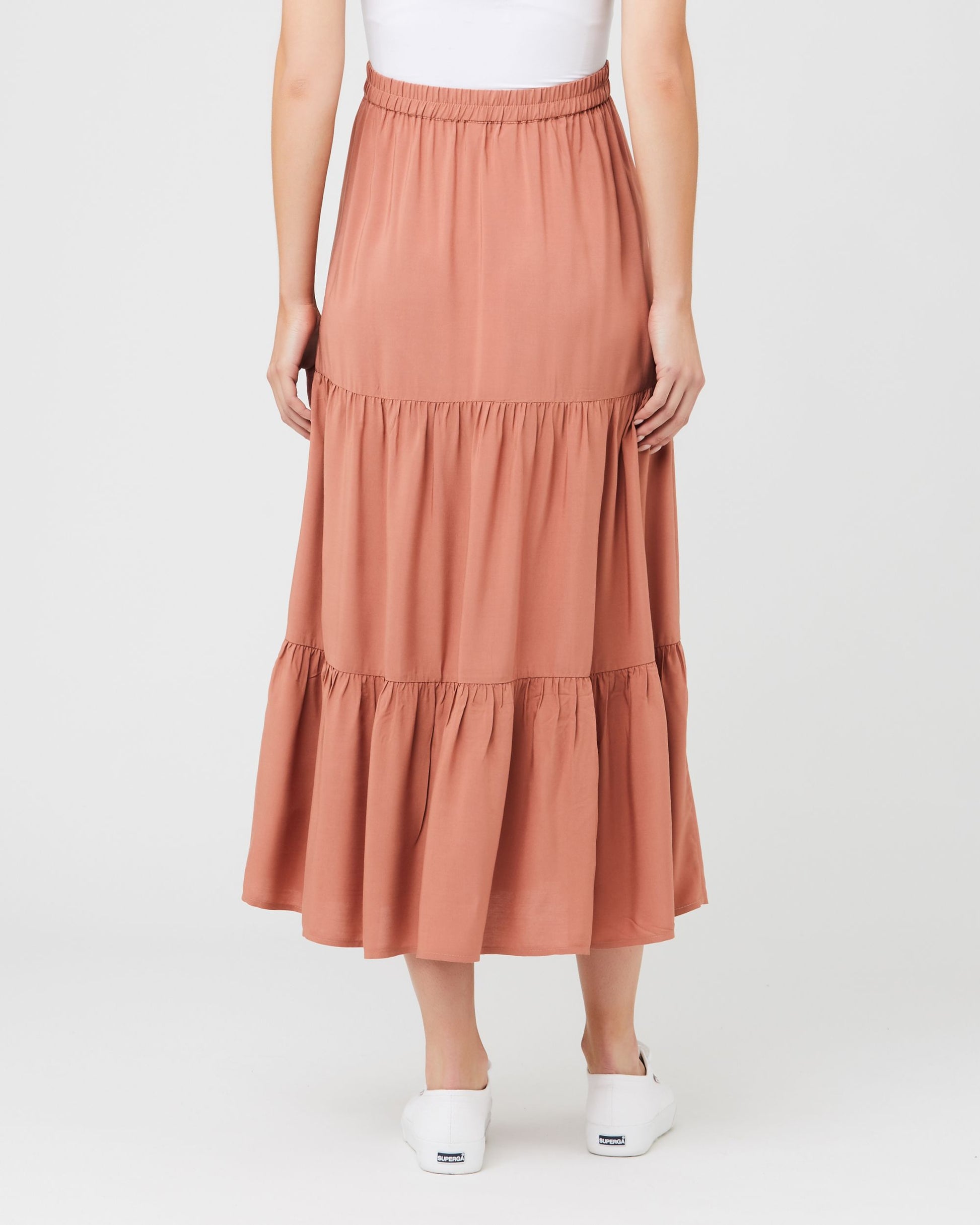 This beautiful tiered skirt is designed to sit over your bump. The elastic waistband has a hidden drawstring so you can tighten and continue to wear this skirt long after your little one arrives. Pair it with one of our must-have tanks!
